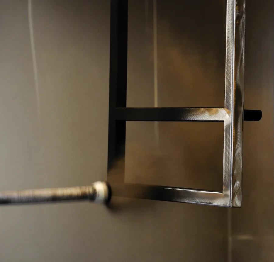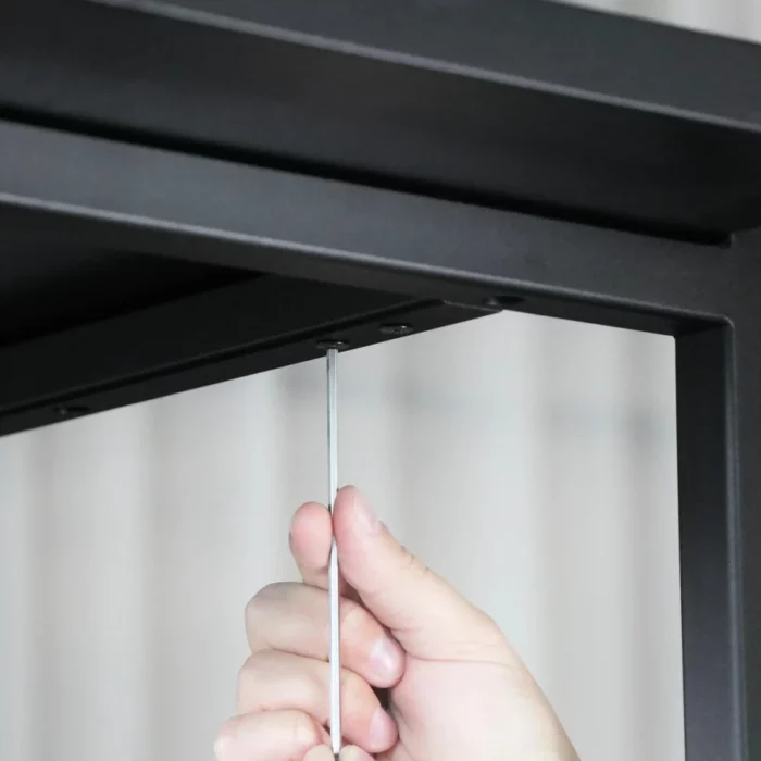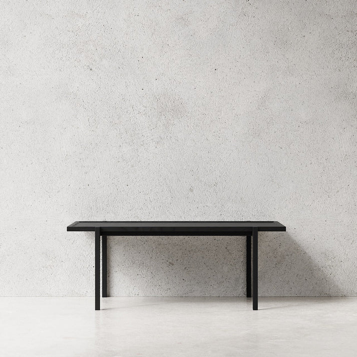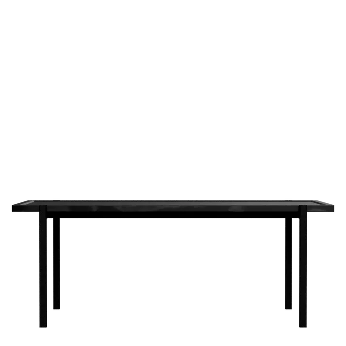Det rektangulære Sofabord 115x55 har en slank sort pulverlakeret stålramme, der hviler på fire fine ben og bærer en bordplade i sortlakeret massivt asketræ. Det enkle udtryk og de eksklusive materialer skaber et tidløst møbel, der er designet til at holde i generationer.