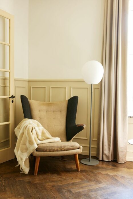 Wrong gulvlampen bruger E27-fatning, så du frit kan vælge pæretype og lysstyrke efter behov. Lampen leveres uden lyskilde. Stofledningen fuldender det gennemførte design og gør placeringen fleksibel.