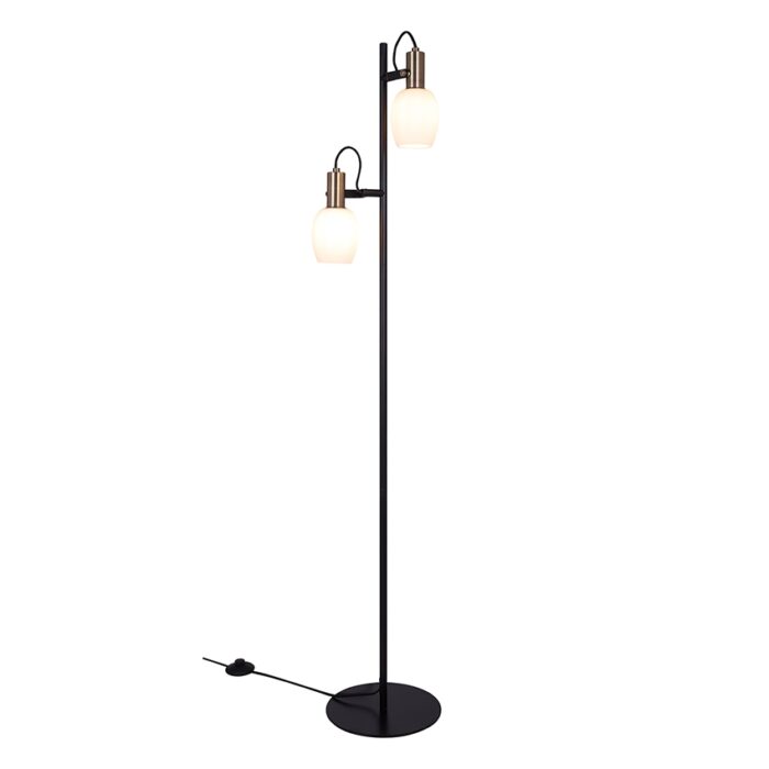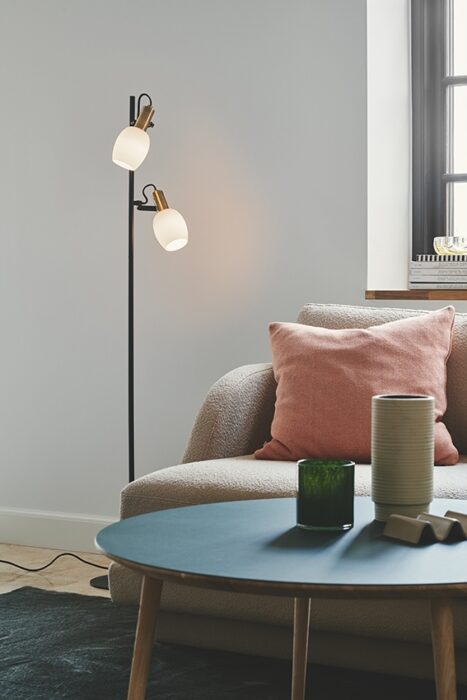 Nordlux Arild Gulvlampe Black forener nordisk elegance med et industrielt strejf. Den slanke konstruktion i mat sort metal understøttes af fine messingdetaljer, mens den mundblæste skærm i opalhvidt glas giver et blødt, diffust lys, der skaber en behagelig atmosfære i rummet.