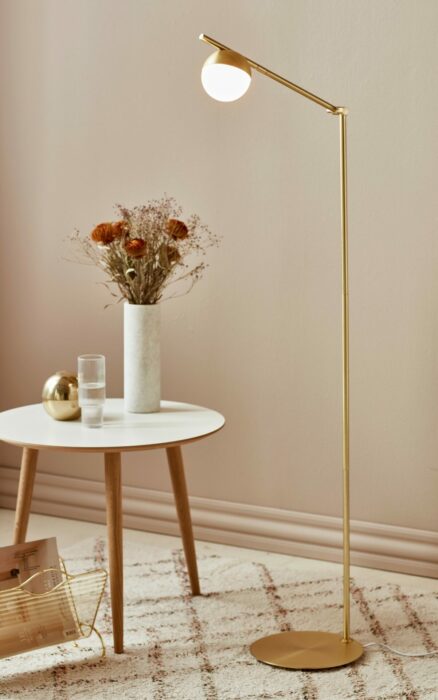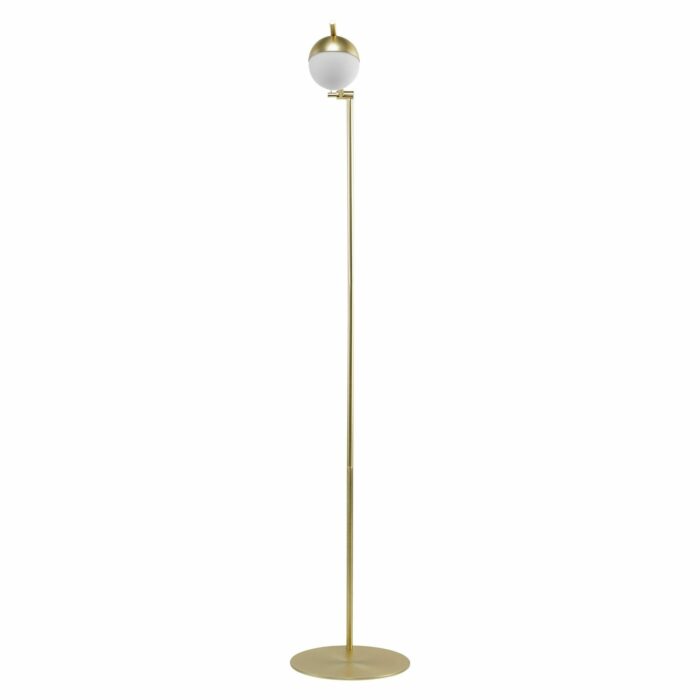 Nordlux Contina gulvlampe i messing er en eksklusiv lampe, der forener moderne art deco-stil med praktisk anvendelighed. Lampen er udført i et slankt metalstel med en rund, mundblæst kuppel i opalhvidt glas, der spreder et behageligt, blændfrit lys.