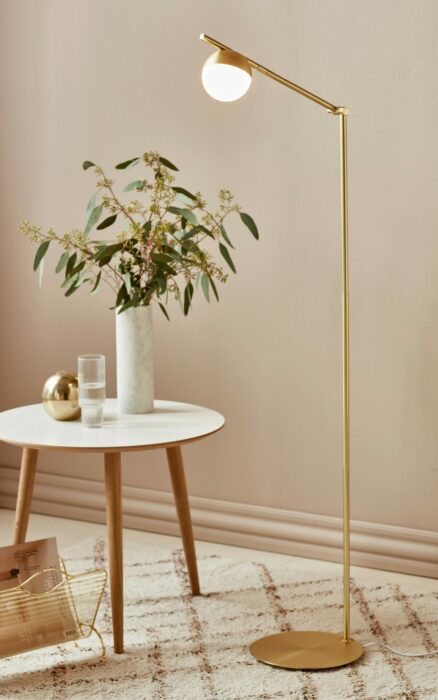 Nordlux Contina gulvlampe i messing med mundblæst opalglas og justerbar skærm. Elegant design i moderne art deco-stil – perfekt til stuen eller læsehjørnet.