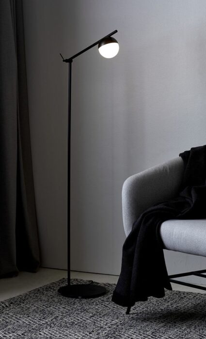 Nordlux Contina gulvlampe i sort med justerbar arm og mundblæst glaskuppel. Elegant design af Says Who, der giver fleksibel og blændfri belysning.