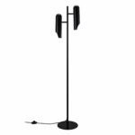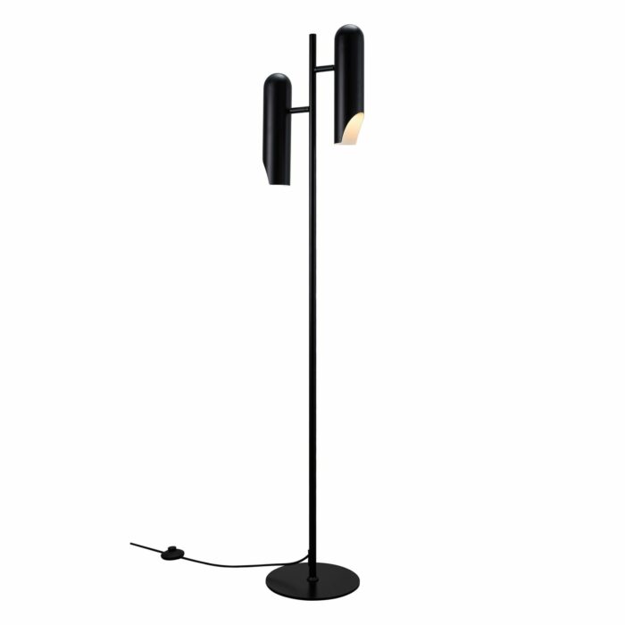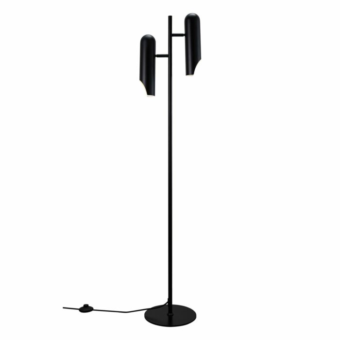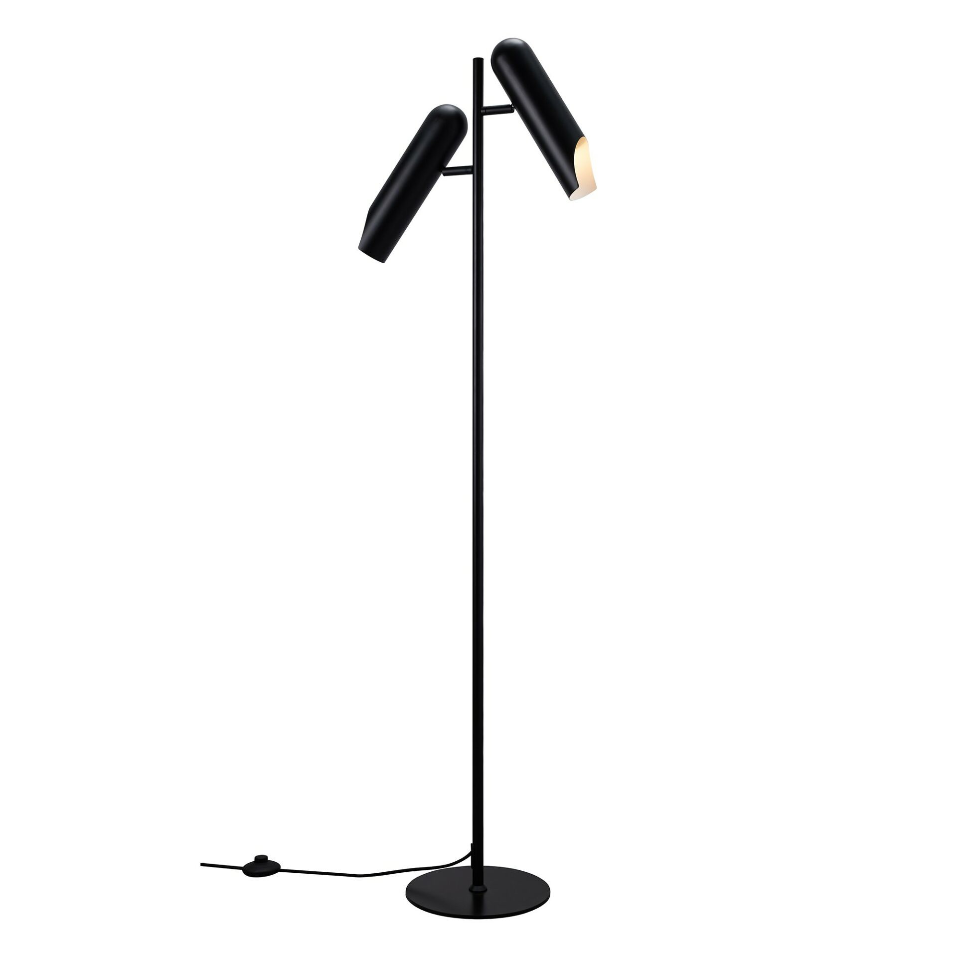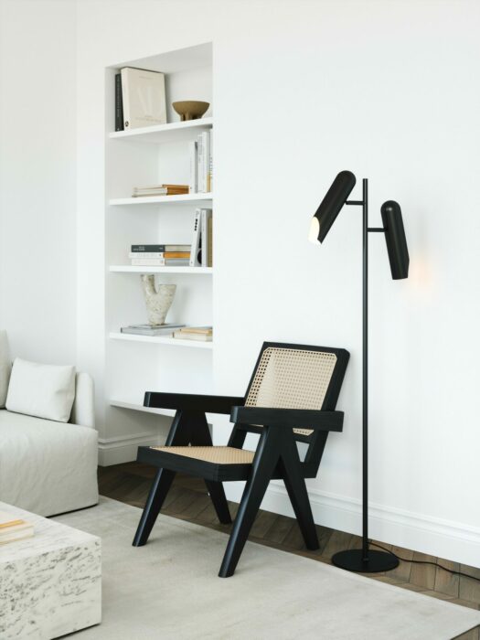 Nordlux Rochelle gulvlampe i sort metal med to justerbare GU10-hoveder. Minimalistisk italiensk-inspireret design til læse- og arbejdslys i stue og kontor.