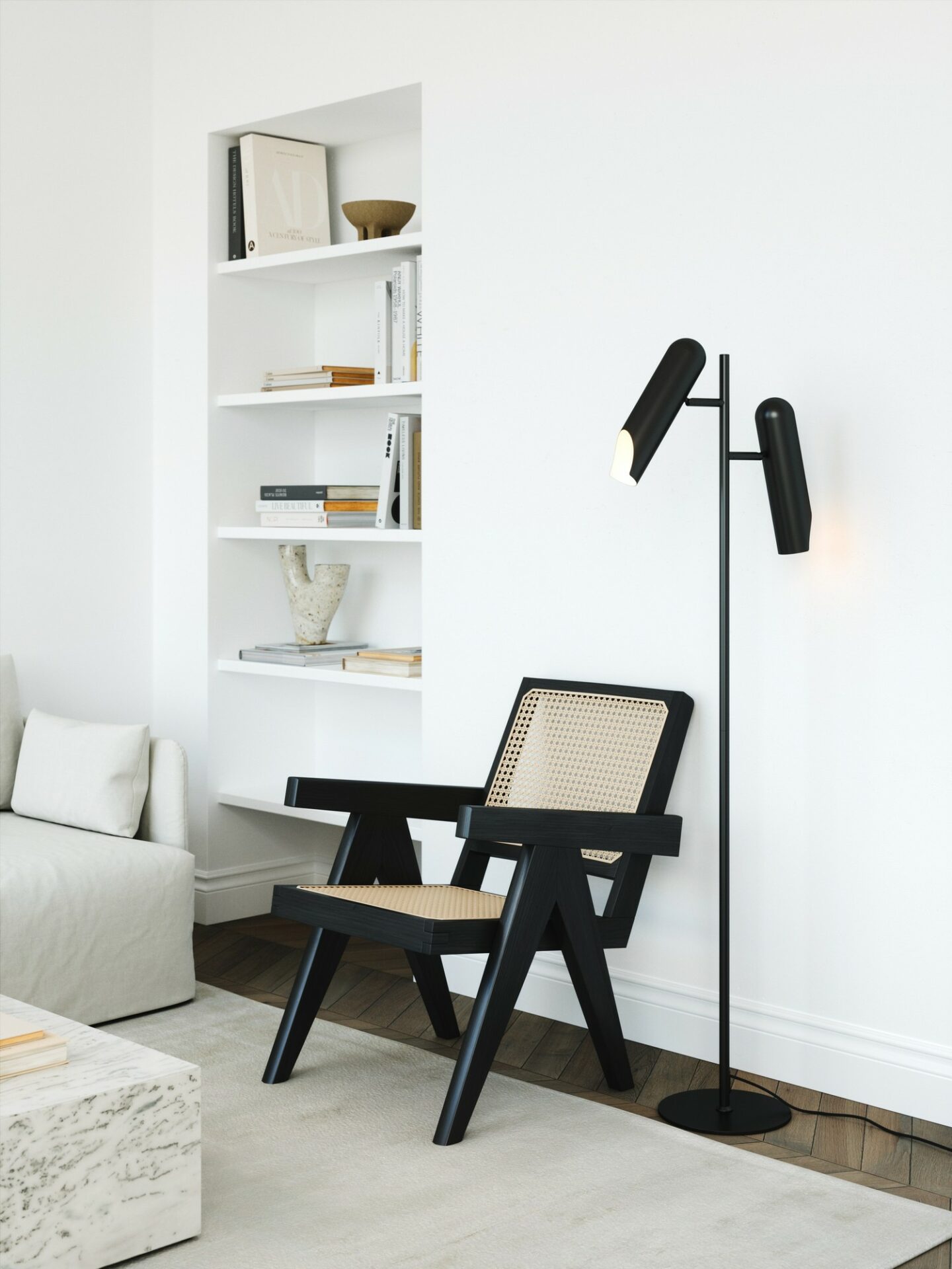 De justerbare hoveder kan drejes og vippes, så du nemt kan rette lyset præcis derhen, hvor du har brug for det. Det gør Rochelle ideel som læselampe eller arbejdslys, og du kan bruge de to lyskilder til at skabe både funktionelt og stemningsfuldt lys i samme lampe. Den sorte metalfinish giver et roligt og stilrent helhedsindtryk, der passer ind i både moderne og klassiske indretninger.