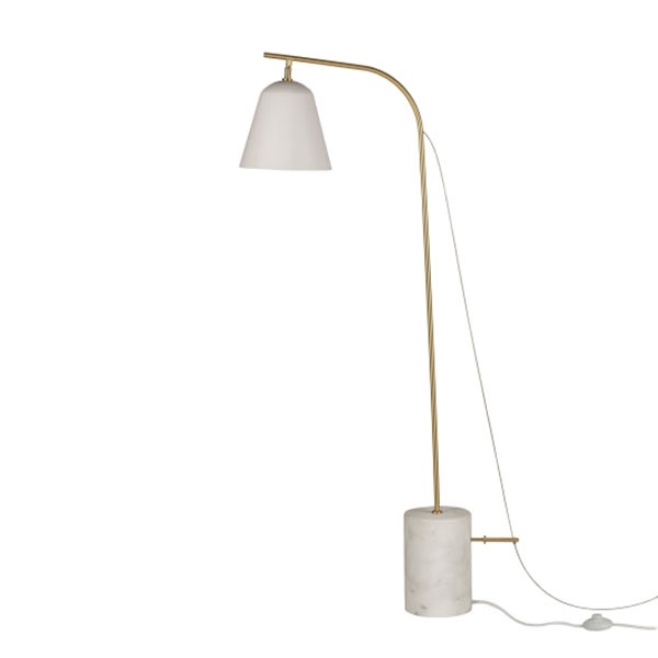 NORR11 Line One gulvlampe i hvid og messing med marmorfod. Elegant designlampe med blødt lys – perfekt til moderne skandinavisk indretning.