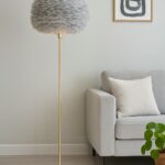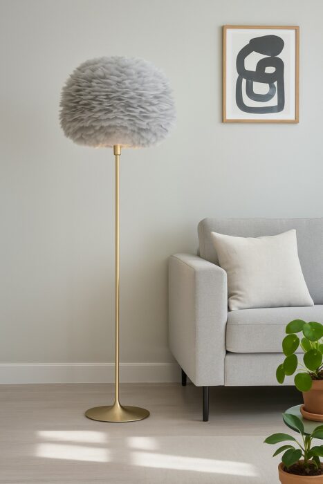 Sættet fuldendes af Santé gulvstanderen, designet af Anders Klem. Med sin slanke profil og børstede messingfinish tilføjer standeren et eksklusivt nordisk præg og en elegant kontrast til den organiske fjerstruktur. Den robuste fod sikrer stabilitet, mens de nøje udvalgte materialer vidner om høj håndværksmæssig kvalitet.