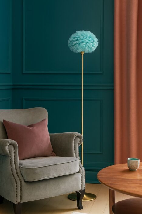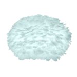 Eos Evia-skærmens form er inspireret af Eos, morgenrødens gudinde i græsk mytologi, og minder om lette skyer, der svæver på himlen. Den er håndlavet af naturlige gåsefjer, som filtrerer lyset på en blød og varm måde, og tilfører rummet både hygge og elegance. Den lyseblå farve giver et frisk, moderne udtryk, der passer perfekt til både skandinaviske og mere farverige hjem.