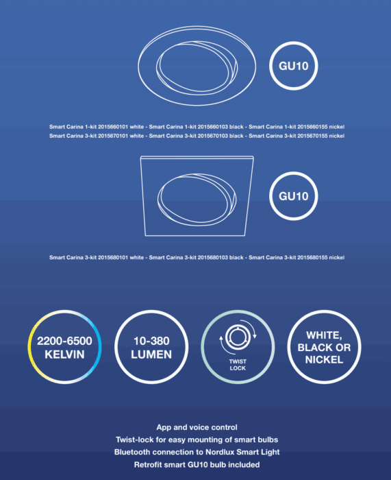 Carina indbygningsspot er integreret med den nyeste teknologi indenfor Bluetooth Mesh, som gør det nemt at tænde og slukke lyset med brug af din mobil. Lige meget om du er uden- eller indenfor vil Bluetooth sørge for en stabil forbindelse mellem lyset og din enhed.