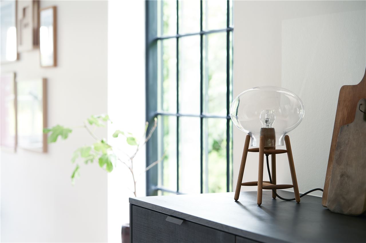 Det klare, ovale glas fremhæver lyskilden og giver lampen et let og luftigt udtryk, mens stellet i FSC-certificeret valnød tilfører en varm og eksklusiv kontrast. Resultatet er en lampe, der forener klassisk dansk designtradition med et moderne, tidløst formsprog.