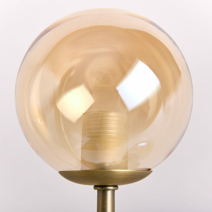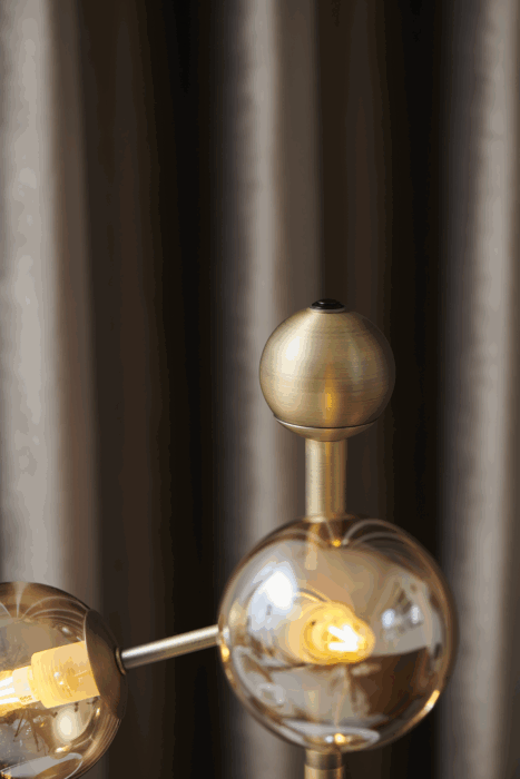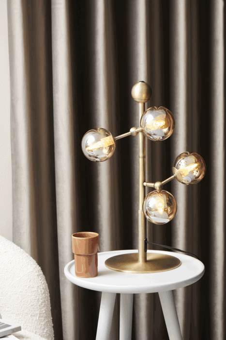 Med Atom Bordlampe Antique Brass/Amber får du en sofistikeret bordlampe, der ikke bare fungerer som en belysningsløsning, men også som et skulpturelt element i din indretning. Lampens varme, ravfarvede glaskupler, kombineret med den antikke messingfinish, spreder et behageligt og indbydende lys, som skaber en hyggelig atmosfære i spisestuen, stuen eller soveværelset.