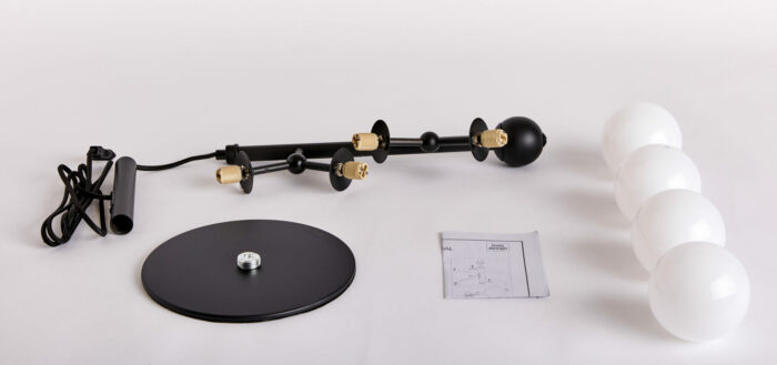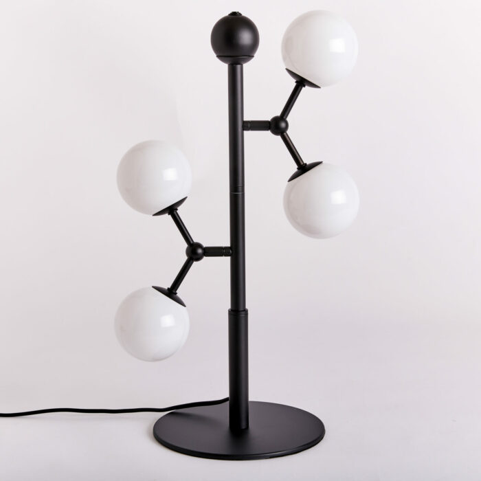 Lampen har en diameter på 22 cm og en højde på 52 cm, hvilket gør den til en iøjnefaldende, men stadig kompakt løsning til mange indretninger. De fire opalglas-skærme på Ø10 cm sikrer en blød og behagelig belysning, mens den sorte metalstruktur tilføjer et eksklusivt touch. Atom-lampen benytter 4 x G9-fatninger og understøtter en maks. effekt på 28W pr. lyskilde.