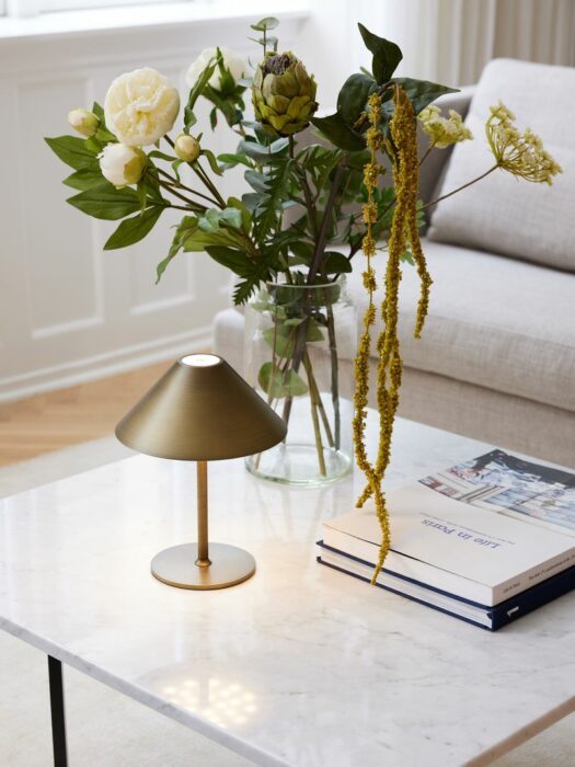 Halo Design Hygge batteri bordlampe Ø19 i antique brass – elegant, dæmpbar LED-lampe med op til 7 timers batteritid. Perfekt til både indendørs og udendørs brug.