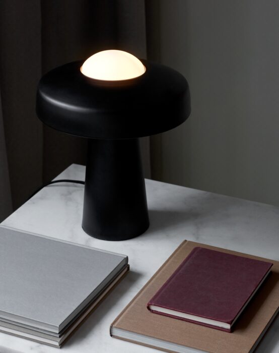 Inspirationen til det lette formsprog er hentet fra svampe i skovbunden, og sammen med kombinationen af mat metal og glas skabes et simpelt og elegant udtryk.