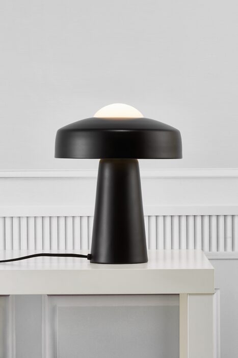 Denne smukke bordlampe forener moderne teknologi med et stilrent og let formsprog inspireret af svampe i skovbunden. Det enkle, men raffinerede design kombinerer mat sort metal og opalhvidt glas, hvilket skaber en harmonisk balance mellem bløde former og markante detaljer.
