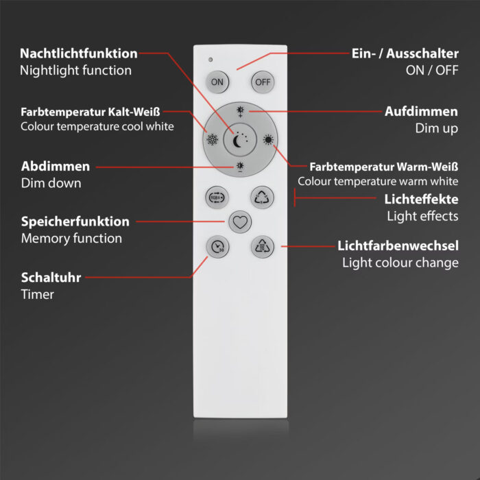 • Funktioner: Fjernbetjening, hukommelsesfunktion, natlys, RGB, timerfunktion