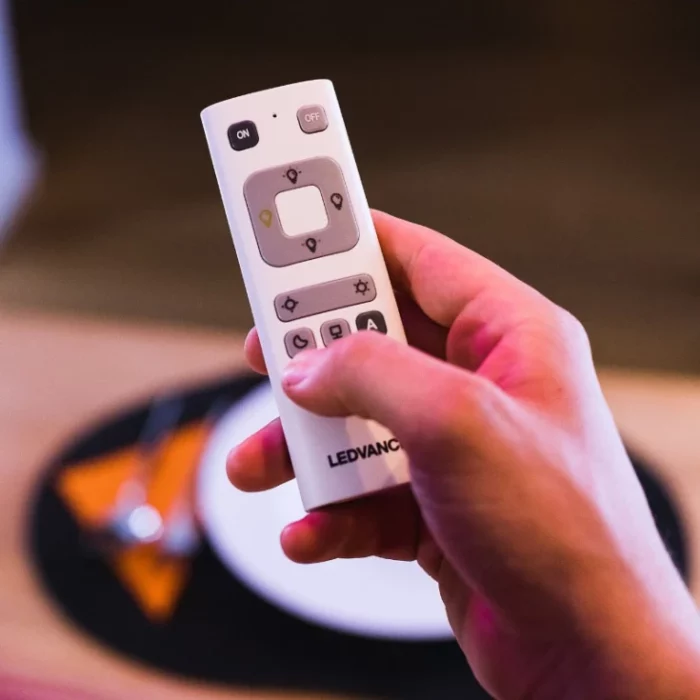 Ud over app- og stemmestyring kan du tilføje ekstra komfort med LEDVANCE Smart+ Remote til WiFi. Fjernbetjeningen fungerer med kompatible Smart+ WiFi-enheder (dog ikke ZigBee eller Bluetooth) og giver hurtig adgang til dine lysindstillinger.