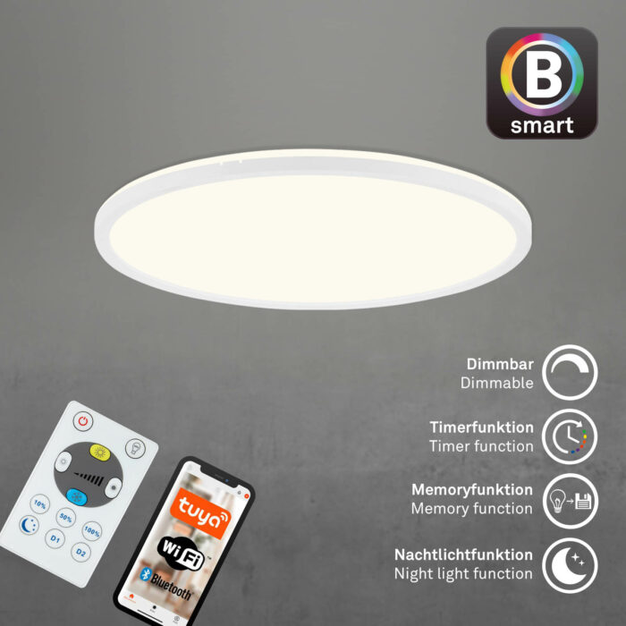 Lampen kan nemt styres fra sofaen ved hjælp af den medfølgende fjernbetjening. Det, der gør dette lys særligt specielt, er stemmestyringen via din stemmeassistent, samt den smarte styring via app på din smartphone. Vælg for eksempel din foretrukne farvetemperatur og juster lysforholdene individuelt til dine behov (2700K - 6500K). Den valgte farvetemperatur gemmes automatisk ved hjælp af den såkaldte hukommelsesfunktion.