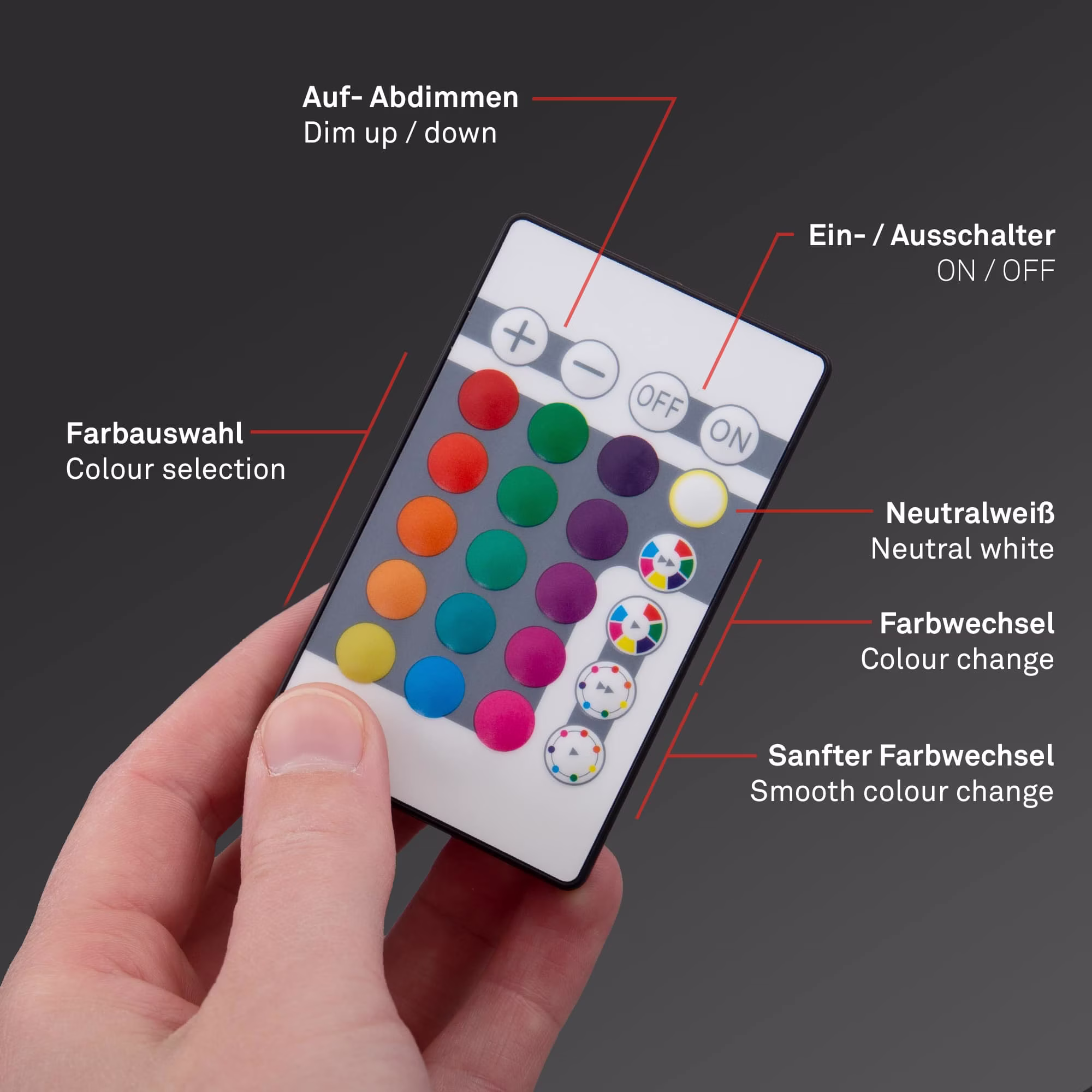 SLIM LED-panelet er udstyret med avancerede lysfunktioner som farveskifte (RGB/W) og trinvis dæmpbarhed, hvilket giver dig mulighed for at tilpasse belysningen til enhver situation. Den medfølgende fjernbetjening giver dig bekvem kontrol over alle funktioner lige fra din sofa, og tilføjer en ekstra grad af komfort til din belysningsoplevelse.