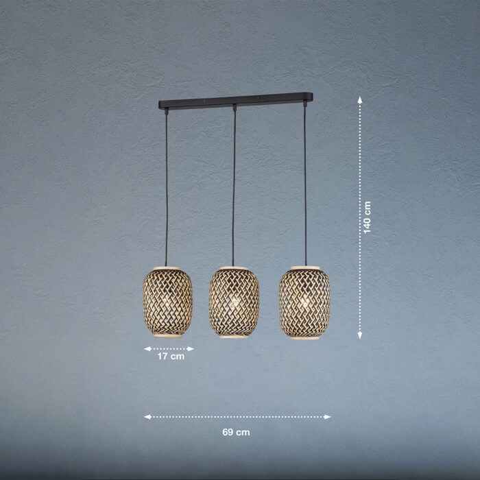 De tre vævede rattanskærme giver ikke kun et behageligt lys, men skaber også fascinerende skyggeeffekter, der forvandler atmosfæren i dine omgivelser. Uanset om den hænger over spisebordet, i stuen eller i gangen, spreder Hummel pendlen en varm og indbydende lysstemning.