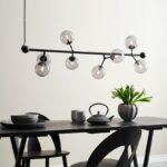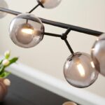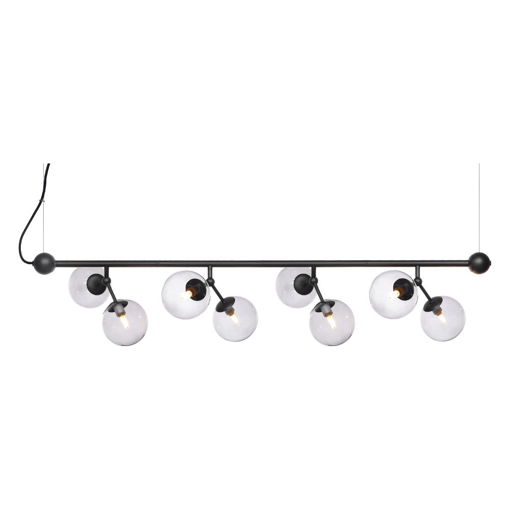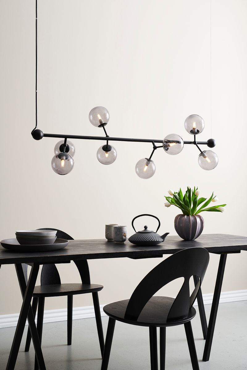 Halo Design Atom langbordspendlen i sort med otte smoke-farvede glaskupler er en lampe, der kombinerer elegant design med en raffineret lyseffekt. De mundblæste kupler i røgfarvet glas giver et blødt, varmt lys, der både fremhæver rummet og skaber en behagelig stemning. Den passer perfekt over spisebordet, køkkenøen eller i opholdsrum, hvor du ønsker en lampe, der både er funktionel og et dekorativt midtpunkt.