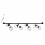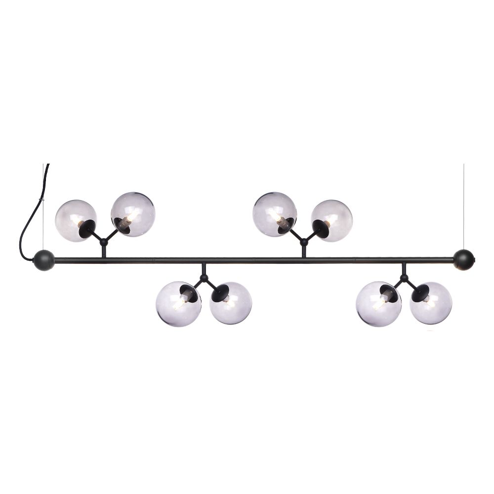 Halo Design Atom langbordspendel i sort med 8 smoke mundblæste glaskupler. Elegant lampe med justerbare arme – ideel til spisebord eller køkkenø.