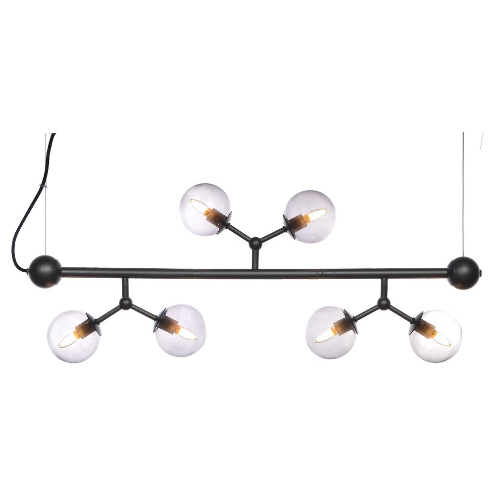 Halo Design Atom Mini langbordspendel i sort metal med røgfarvede glaskugler – dansk design spisebordslampe med 6 G9 fatninger