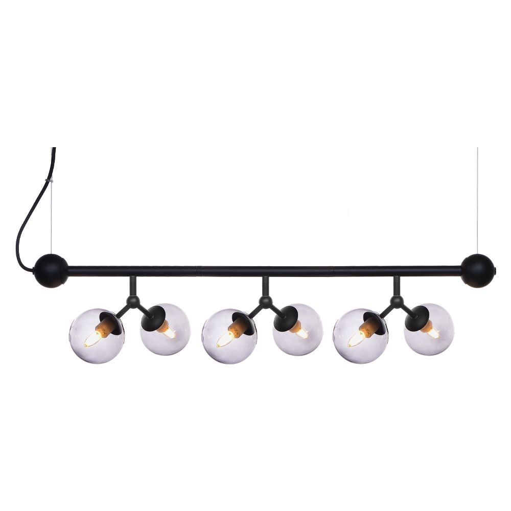 Halo Design Atom Mini langbordspendel i sort metal med røgfarvede glaskugler. Dansk design pendel med 6 G9 fatninger, perfekt over spisebordet eller i entréen.