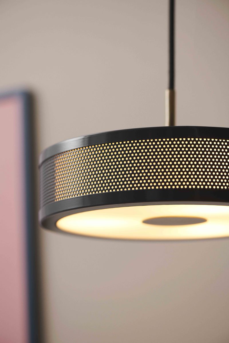 Den sorte overflade med detaljer i antik messing giver lampen et eksklusivt look, som passer perfekt ind i både moderne og traditionelle hjem. Fremstillet i lakeret metal med tekstilledning er den både robust og smuk på samme tid.