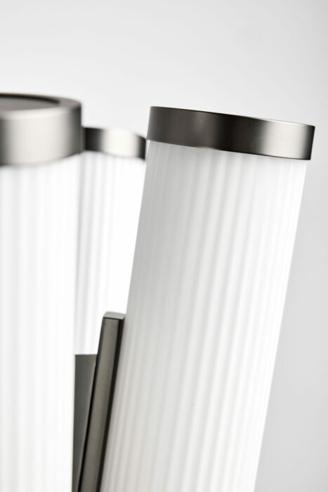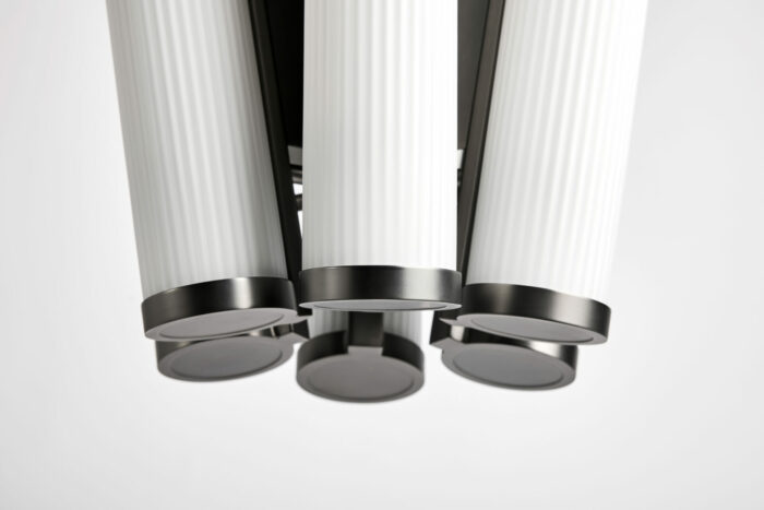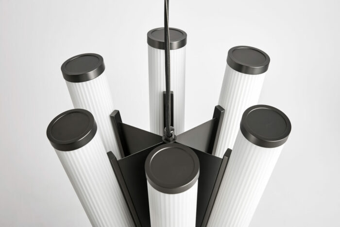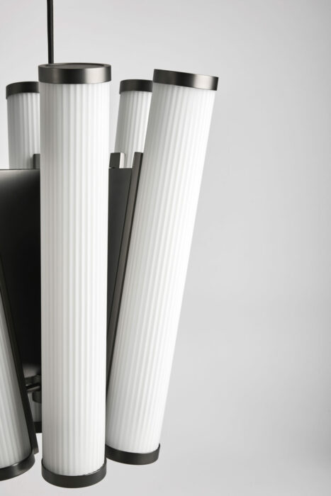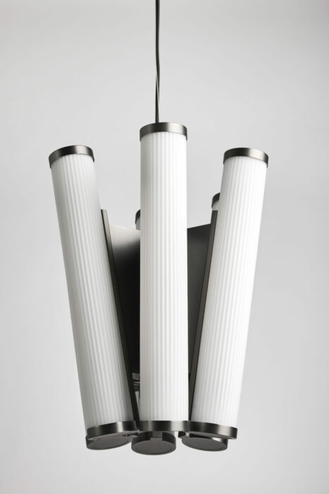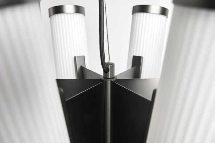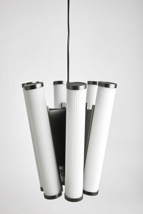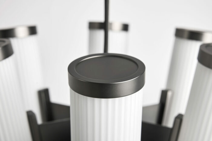 Deco Chandelier imponerer med sin cylinderformede skærm af opalglas, der har en karakteristisk riflet struktur, som tilfører lyset en subtil, flimrende effekt og skaber en indbydende atmosfære i rummet. Dens alsidige design gør den ideel som statement piece over spisebordet, i stuen eller i en entré, hvor dens dekorative lysdetaljer virkelig kan komme til sin ret.