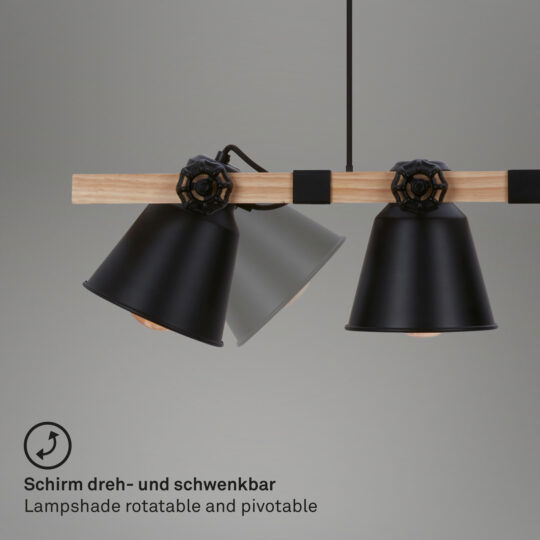 Pendellampen har fire drejelige spots i matsort metal, som kan rettes individuelt ved hjælp af små drejeknapper i antik stil. Denne fleksibilitet gør det muligt at skabe præcis den belysning, du ønsker – uanset om det er til hyggelige aftener, funktionelt arbejdslys eller stemningsfuld baggrundsbelysning.