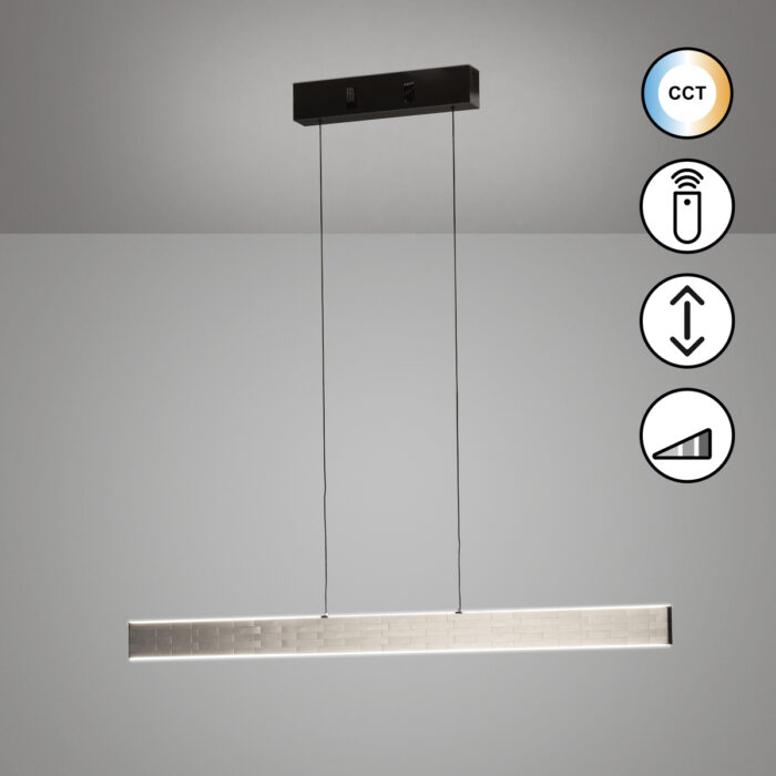 Lampens nikkelfarvede metaloverflade giver et tidløst look, der harmonerer med både moderne og klassiske indretninger. Med den integrerede LED-lyskilde på 31 watt leverer Aluro en imponerende lysstyrke på 4400 lumen, som kan justeres trinløst både i lysstyrke og farvetemperatur (2700K–6500K) via den medfølgende fjernbetjening. Dette gør det muligt at skifte fra varmt hyggelys til koldt arbejdslys efter behov.
