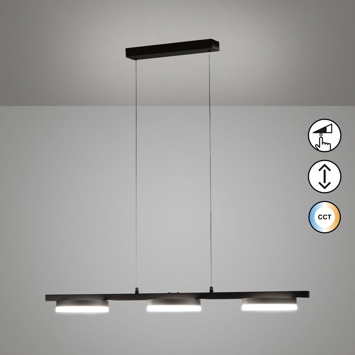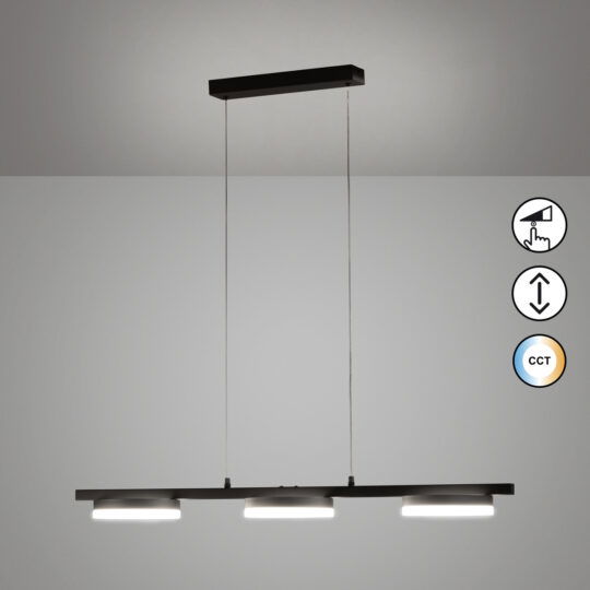 Fischer & Honsel Kiku pendellampe i sort metal – justerbart LED-lys i tre farvetoner, elegant design og trinløs dæmpning. Perfekt over spisebordet.