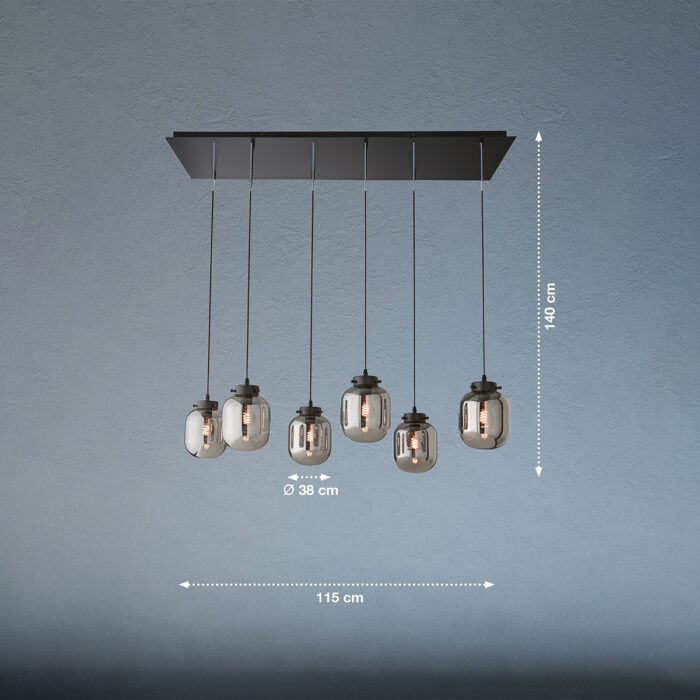 Med en bredde på 38 cm og en længde på 115 cm er denne pendel ideel til større rum eller som centerpiece over spisebordet. Fremstillet i solidt metal og malet i en sofistikeret sand sort, udstråler lampen kvalitet og tidløs charme. Lampens højde kan ikke justeres, men dens generøse overhæng på 140 cm gør den fleksibel til mange loftshøjder.