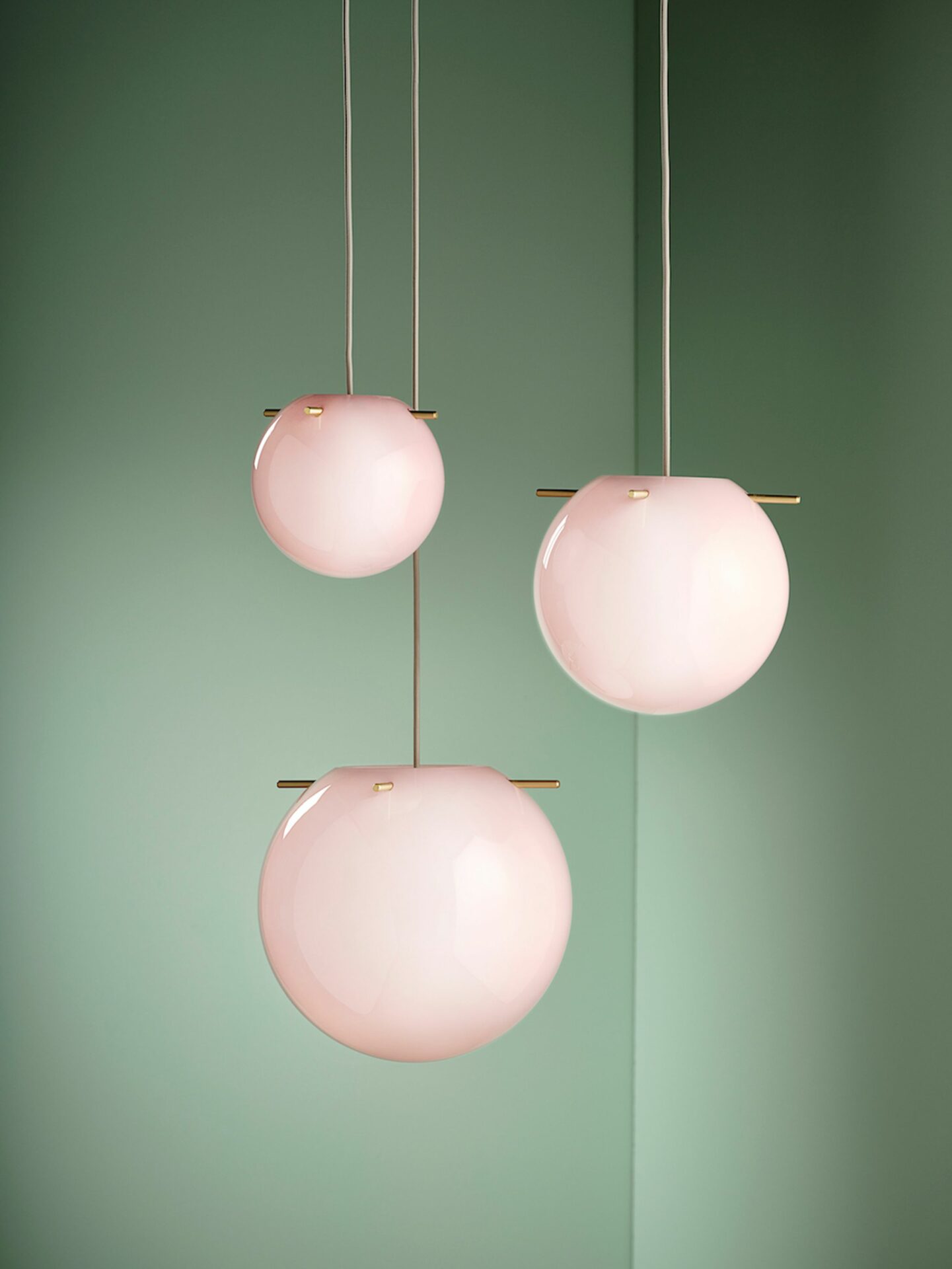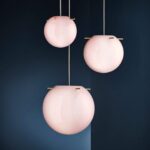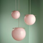 Frandsen Koi Pendant i opal rosa glas med messingstænger. Stor designpendel Ø32 cm af Jonas Birkebæk Poulsen med varmt lys.