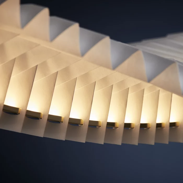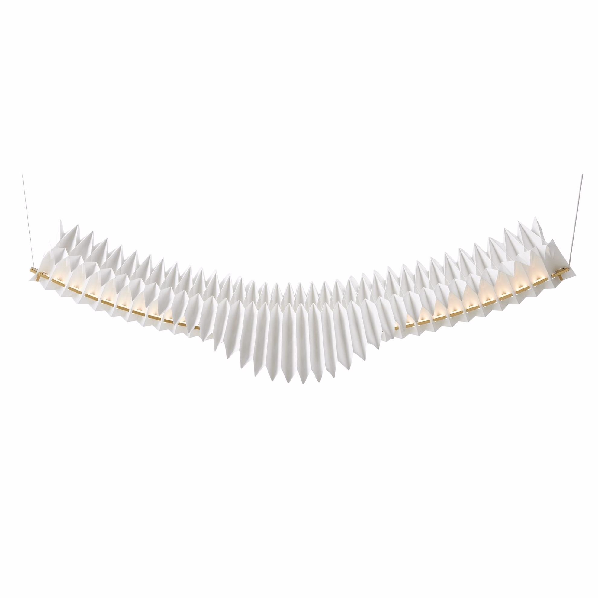 Frandsen Sora Pendel i massiv messing og hvid plisseret skærm – stor designer lampe med LED og origami-design