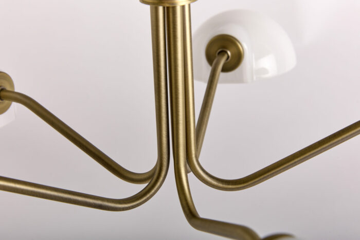 Denne lysekrone er fremstillet i kobberfarvet metal og glas, hvilket giver et smukt spil mellem materialerne og en følelse af luksus. Den er ideel til stuen, spisestuen eller soveværelset, hvor den skaber en indbydende atmosfære med sit behagelige lys.