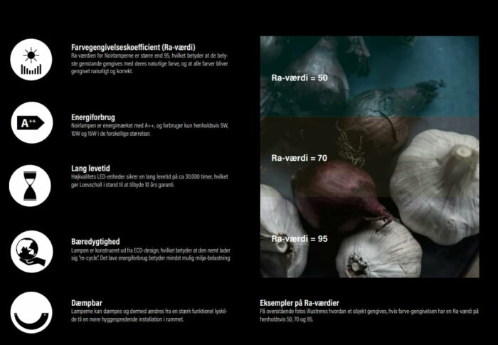 Ra-værdien for Noirlamperne er større end 95, hvilket betyder at de belyste genstande gengives med deres naturlige farve, og at alle farver bliver gengivet naturligt og korrekt.