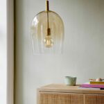 Nordlux Uma 30 Pendel i ravfarvet glas forener moderne æstetik med klassisk elegance. Den mundblæste, ovale glasskærm skaber et levende og eksklusivt udtryk, hvor den smukke farveudtoning gør pæren synlig og fremhæver lampens dekorative karakter. Den karakteristiske snoede stofledning i gylden tekstil understreger lampens håndværksmæssige kvalitet og giver et gennemført, stilbevidst look.
