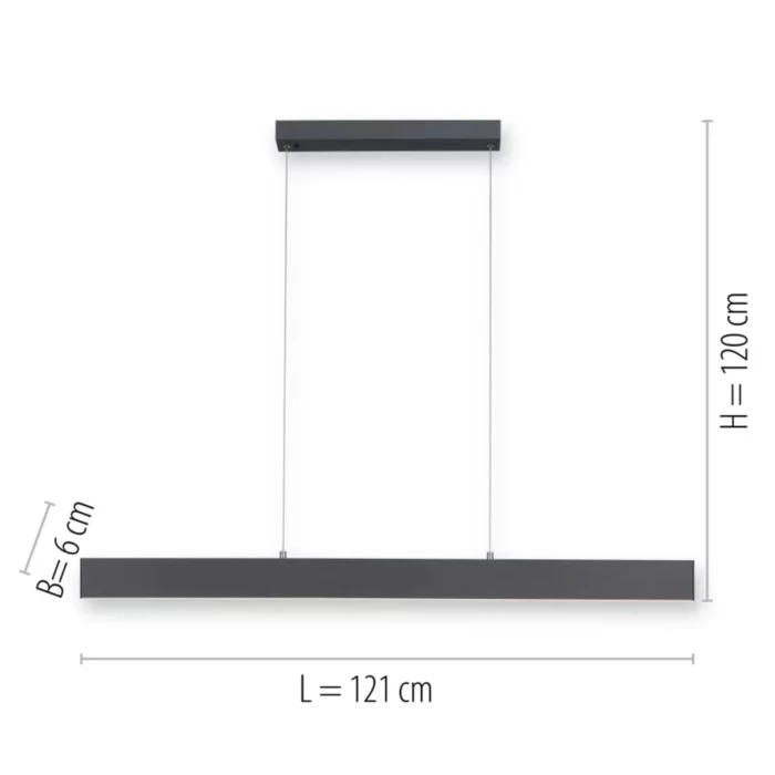 Lampen har følgende mål: Længde: 121 cm, Bredde: 1,5 cm, Højde: 120 cm.