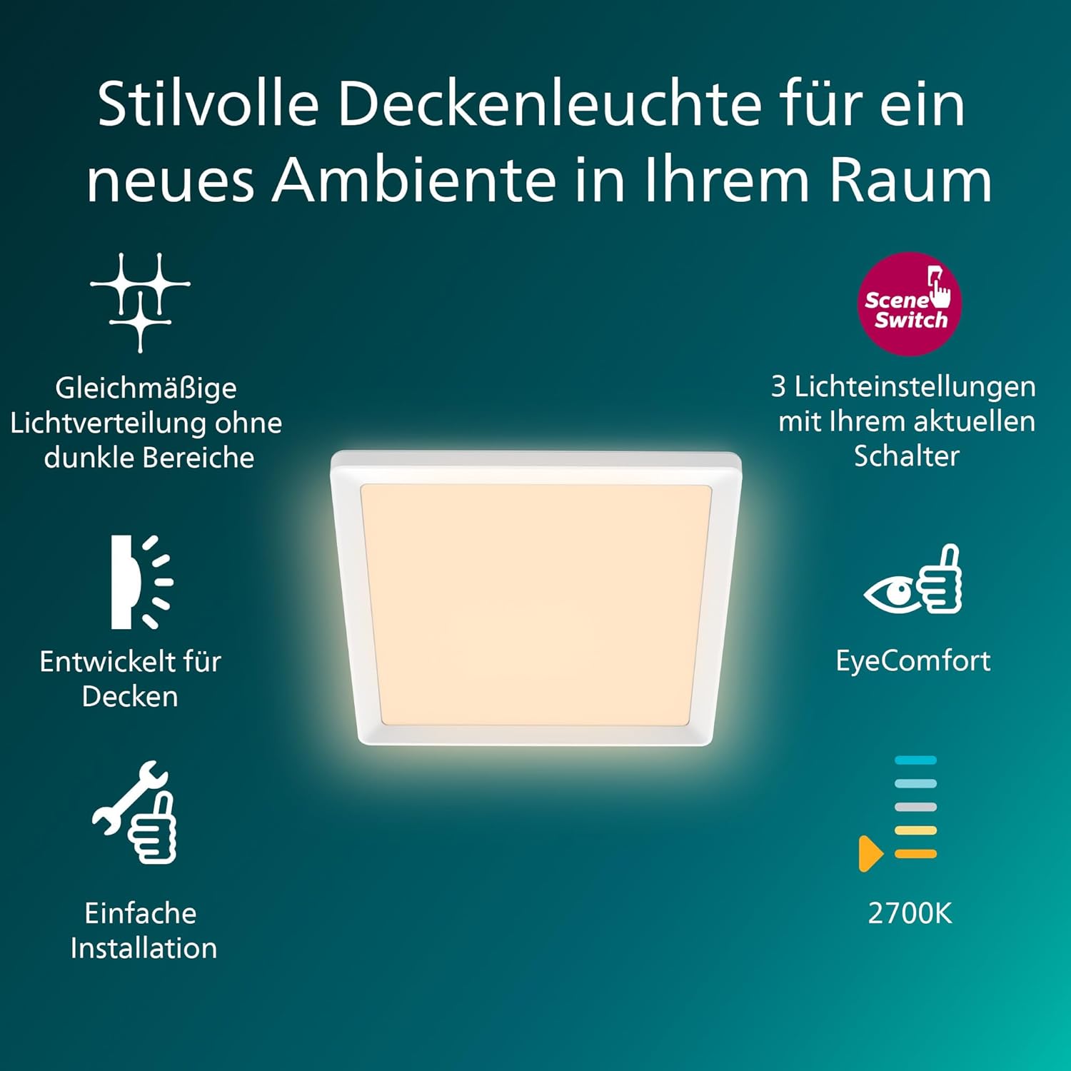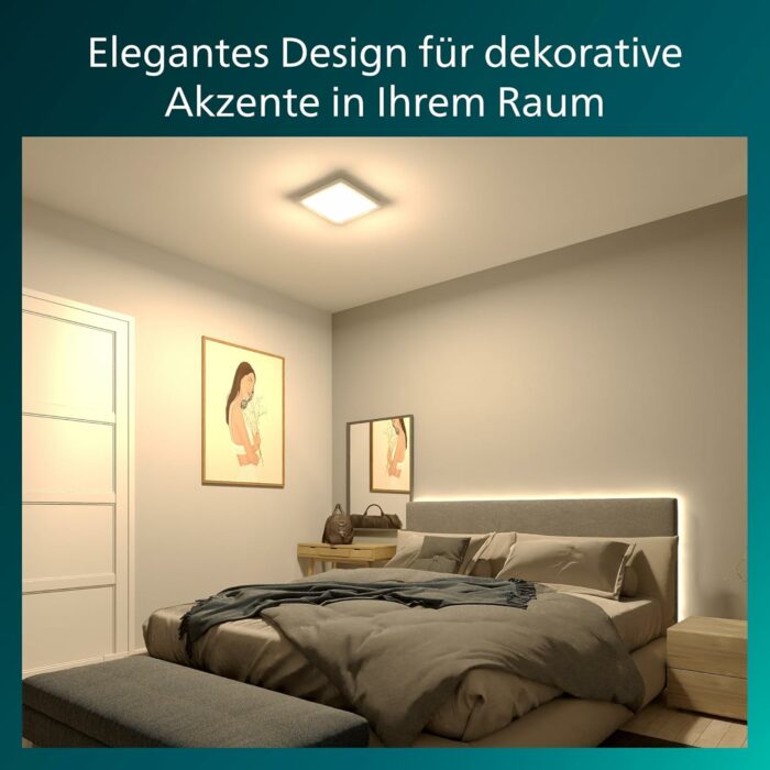 Loftlampen udsender et varmt hvidt lys på 2700K, som skaber en hyggelig og indbydende atmosfære. Samtidig er lampen udviklet med Philips EyeComfort-teknologi, der sikrer en blød og flimmerfri belysning, som er skånsom for øjnene – perfekt til daglig brug i hjemmet.