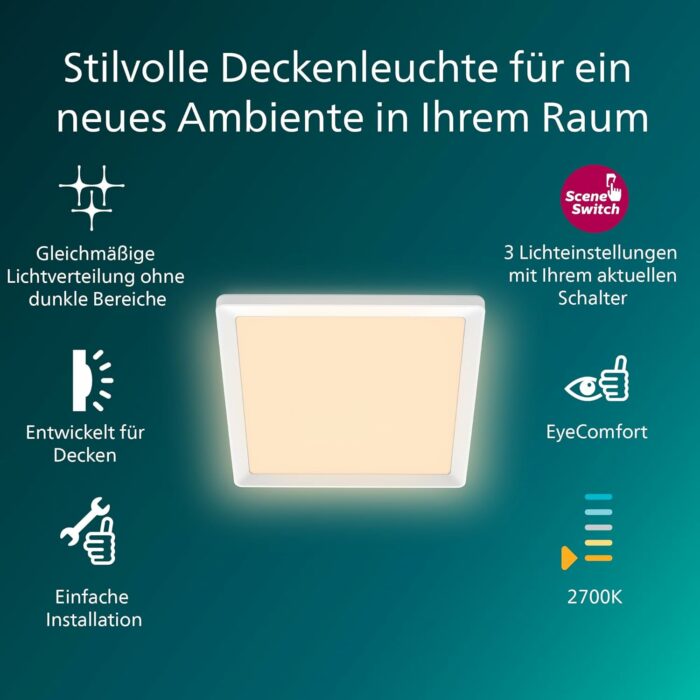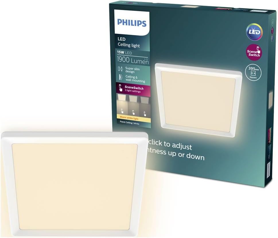 Skab den perfekte belysning til enhver situation med Philips LED SceneSwitch Slim loftlampe. Denne moderne og elegante loftlampe kombinerer funktionalitet, komfort og stil i ét minimalistisk design, der passer perfekt ind i det nordiske hjem. Med sin smarte SceneSwitch-teknologi kan du nemt skifte mellem tre forskellige lysniveauer – helt uden installation af lysdæmper.