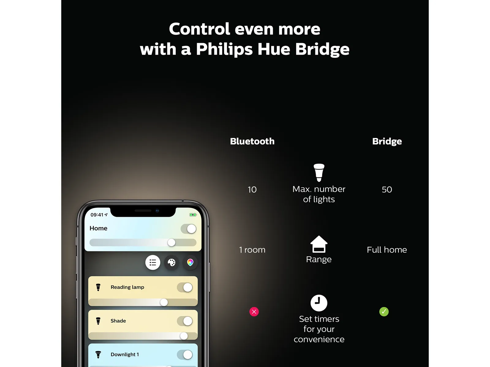 Ved at tilføje en Hue Bridge åbnes alle mulighederne for intelligent belysning: styring når du ikke er hjemme, automatiserede lysrutiner, avancerede scener og en pålidelig, sikker løsning, der gør din belysning til en oplevelse i sig selv.
