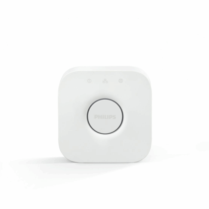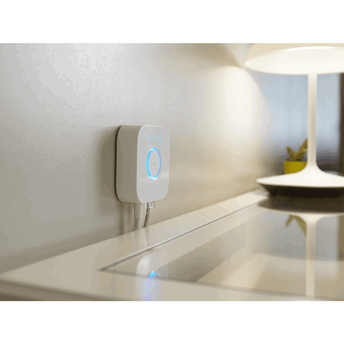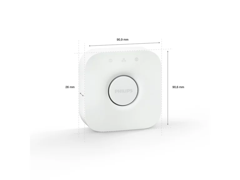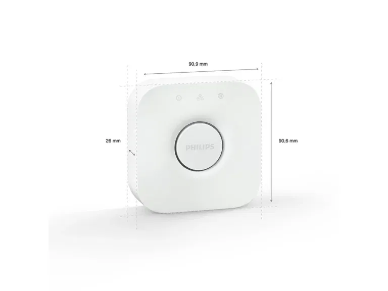 Med sit kompakte, hvide design glider Hue Bridge ubemærket ind i ethvert hjem. Den kræver kun minimal plads og kan nemt placeres tæt på din router.