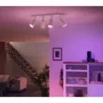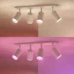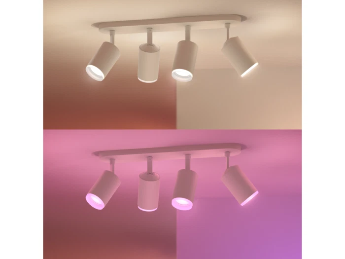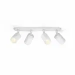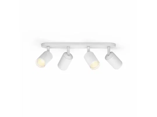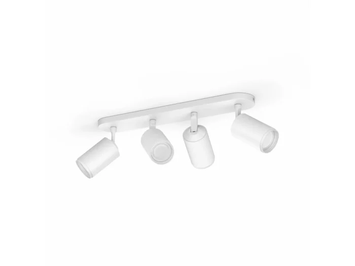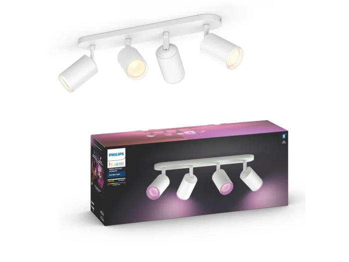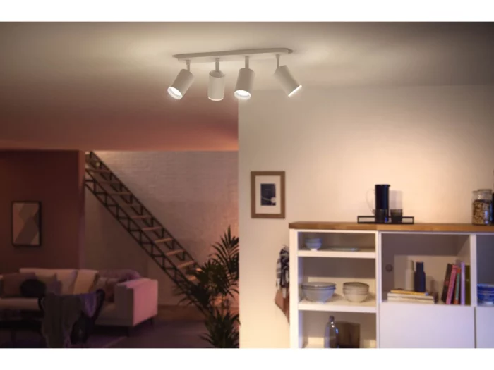 Philips Hue Fugato har et elegant, moderne design i mat hvid metal, der passer perfekt til det skandinaviske hjem. De fire justerbare spotlygter giver både funktionelt arbejdslys og stemningsfuldt baggrundslys – ideel over sofabordet, i køkkenet eller langs en væg.