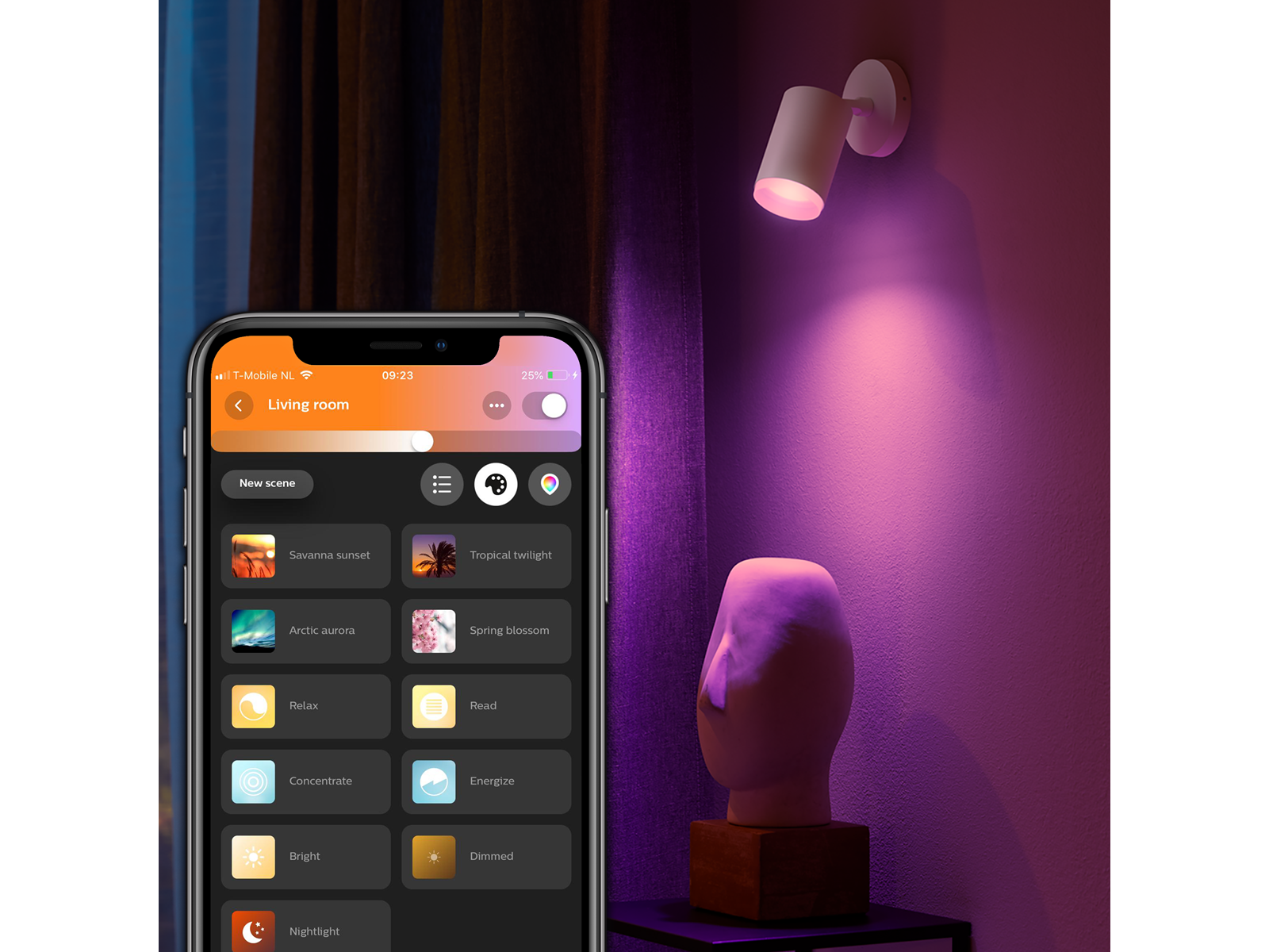 Styr lyset direkte fra din telefon med Philips Hue Bluetooth-appen. Tænd, sluk, dæmp og skift farve med et enkelt tryk – uden brug af ekstra udstyr.
