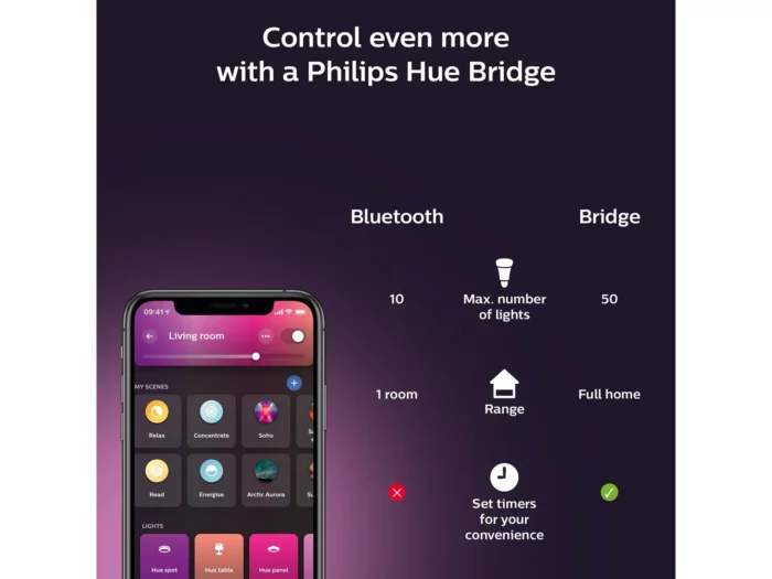 Betjen lampen via Hue Bluetooth app, Hue Dimmer Switch eller Hue Bridge (til mere avancerede funktioner).