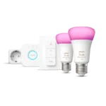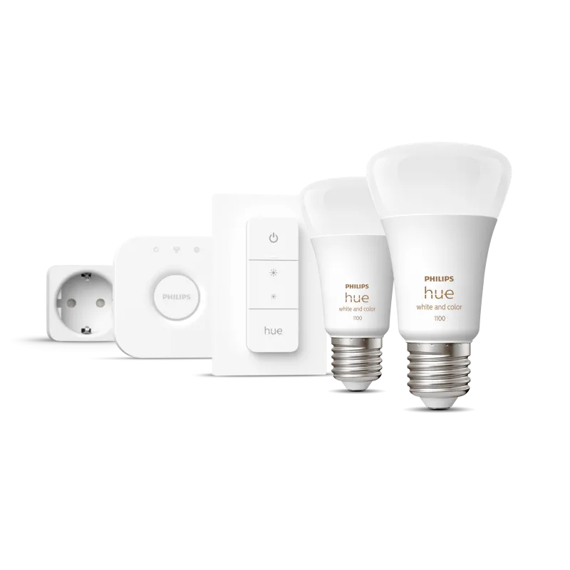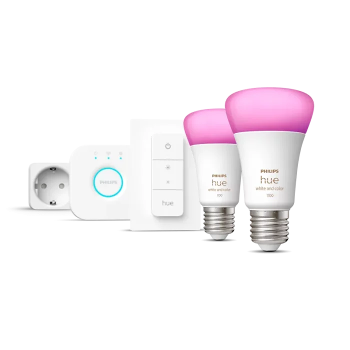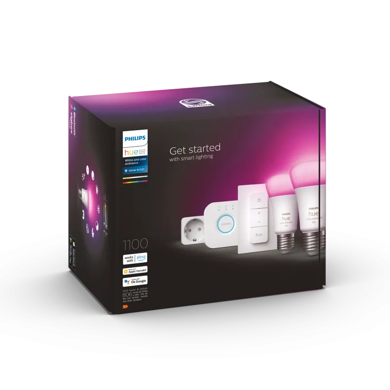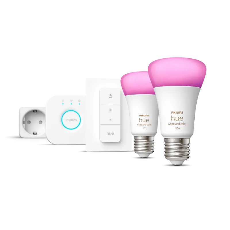 Oplev intelligent belysning på et helt nyt niveau med dette komplette Philips Hue White and Color Ambiance startsæt, der giver dig fuld kontrol over lyset i dit hjem. Sættet indeholder to E27 pærer, en Hue Bridge, en Dimmer switch, der fungerer som både trådløs vægkontakt og fjernbetjening, samt en Smart plug, der giver dig mulighed for at styre dine almindelige lamper og elektriske apparater via Hue appen.