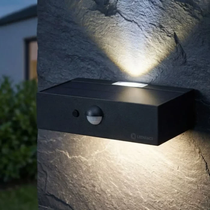 Ledvance Endura solcelle væglampe i sort med sensor. IP65 udendørslampe med 300 lumen og varm hvid LED – perfekt til facade og have uden kabler.
