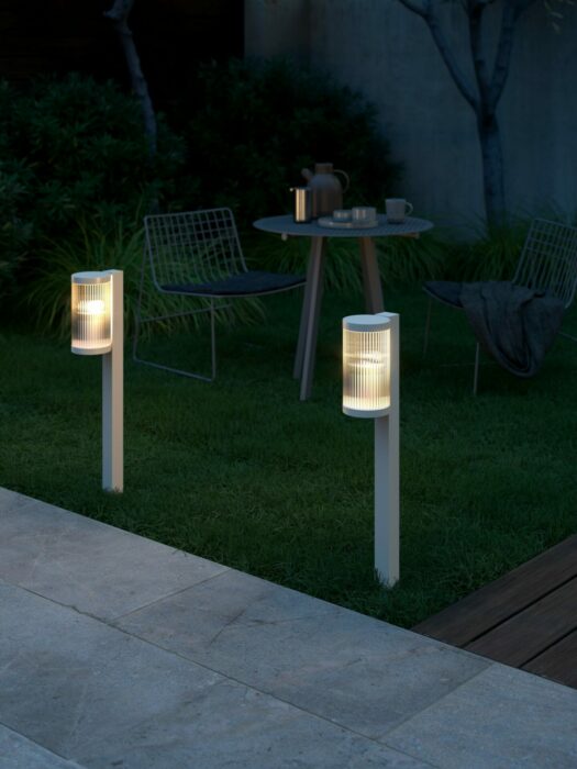 Den ribbede skærm sørger for et blødt, diffust lys, som både skaber tryghed og et dekorativt lysspil i omgivelserne. Samtidig bidrager det afrundede design og de rene linjer til et eksklusivt og tidløst udtryk, der passer perfekt til moderne arkitektur og nordiske uderum.