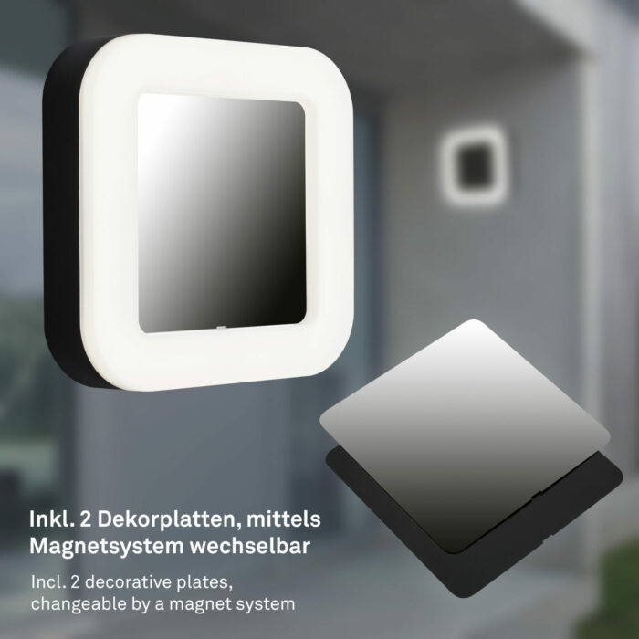 En af de mest unikke egenskaber ved denne væglampe er de to medfølgende dekorative paneler i sort og rustfrit stål. Disse kan nemt udskiftes takket være et innovativt magnetisk system, så du kan tilpasse lampens udseende efter din personlige stil eller omgivelserne.